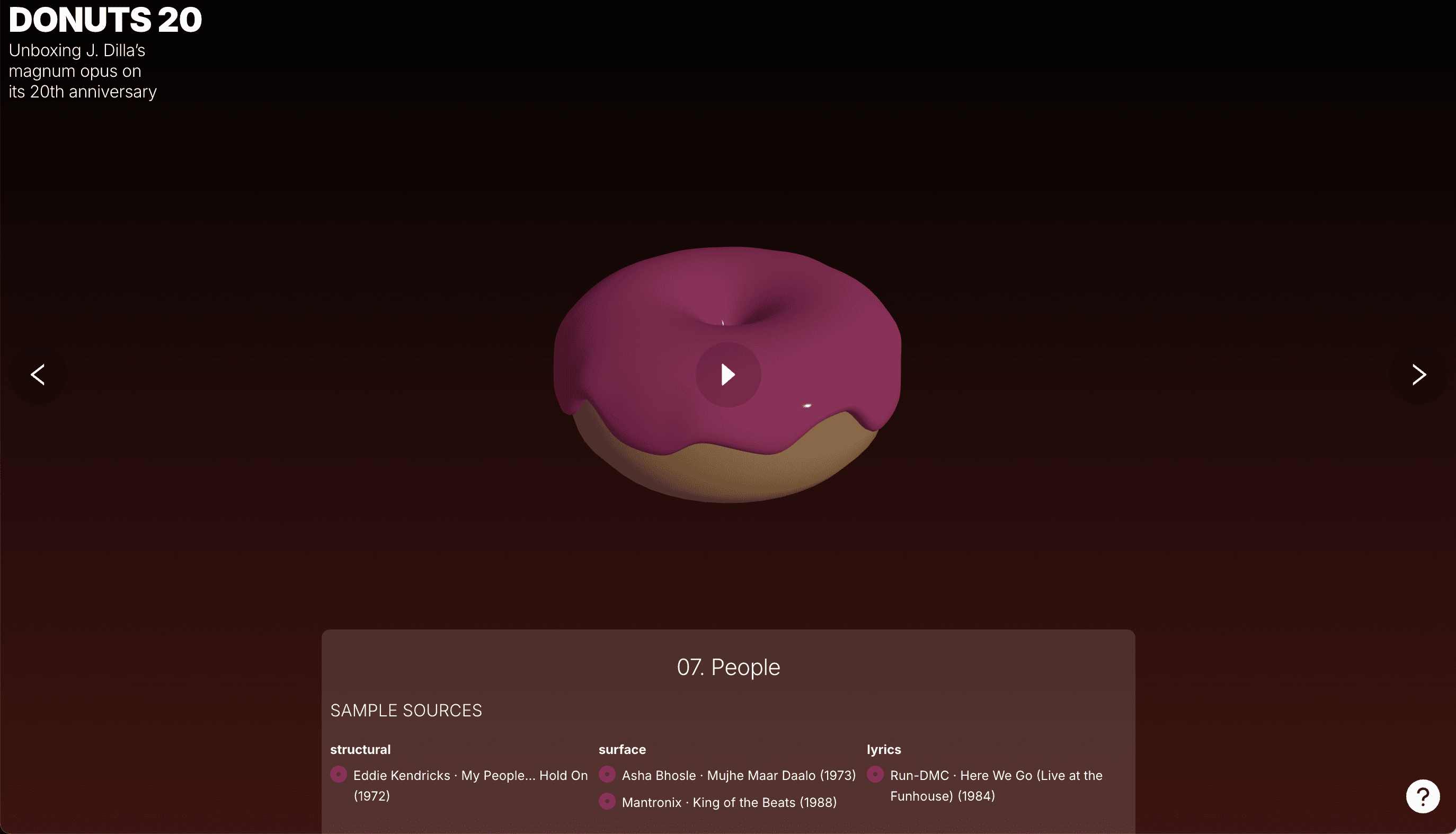 The interactive experience allows you to listen to his magnum opus track-by-track, alongside the sample source material, giving insight into Dilla’s process of sampling and crafting a new narrative via creative re-use, deconstruction, and recontextualization. By spinning the 3-D donut left and right, users navigate through the album audio, while a pull-out drawer displays the structural, surface, and lyrical samples used for each track. Visitors use headphones to listen, seamlessly comparing and cross-referencing the original samples with Dilla’s flips. The project combines aspects of interactive media art, music journalism, storytelling, and cultural archivism.
