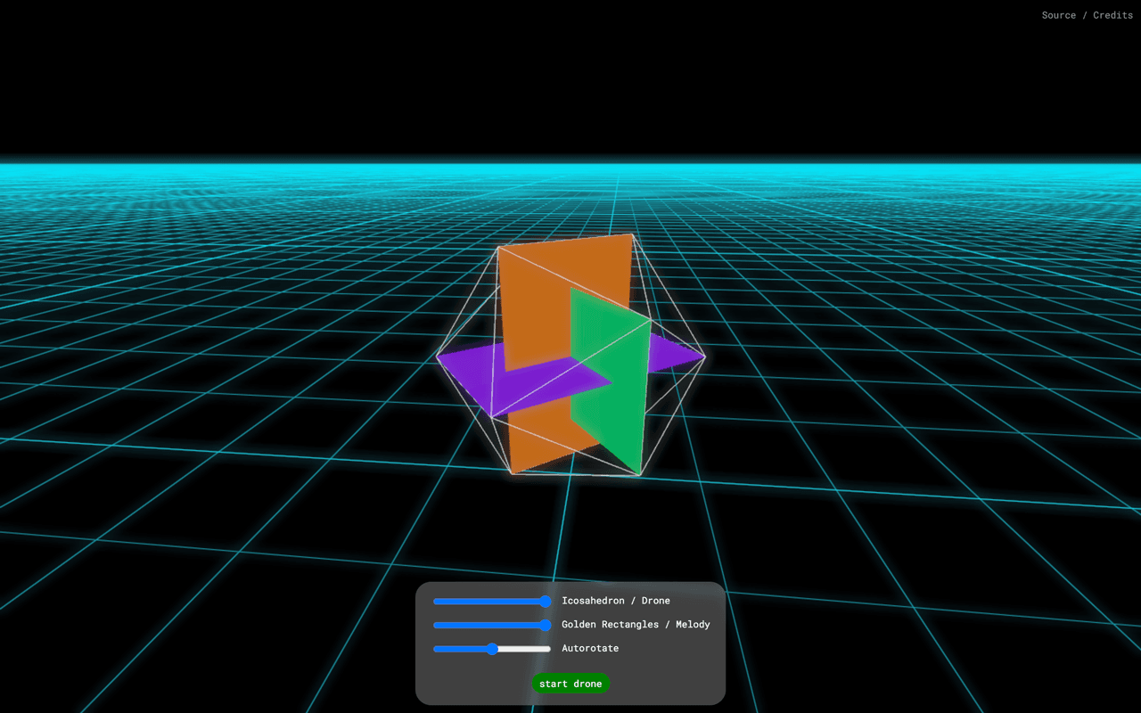 This project is to demonstrate the astounding geometry of three intersecting, orthogonal, golden rectangles and an inscribed regular icosahedron, as well as the three interrelated musical tonalities of G, Eb, and B